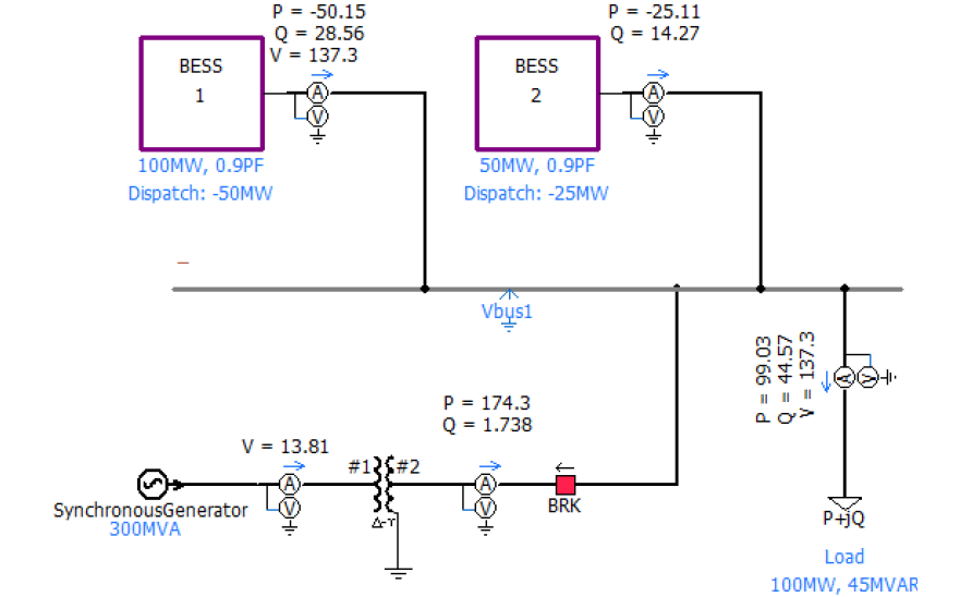 The combined MVA rating of the BESS models must be sufficient to fully supply the load upon disconnection of the synchronous generator. The synchronous generator MVA rating must be sufficient to simultaneously serve the load and charge both BESS at their rated maximum charge power. Both BESS models should be in voltage control mode with the same voltage and frequency droop settings and set points. All protection settings in the BESS should reflect the equipment planned to be installed in the field; however, settings should be set as wide as possible within the equipment ratings and capabilities (as recommended in NERC reliability guidelines [8, 11, 12]) since the tests may subject the GFM BESS to extreme frequency, voltage, and phase jump events.
