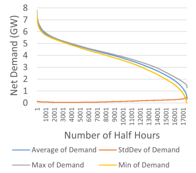 Finally, Figure 6 shows the distribution statistics for net demand duration curves for each of the eight profile years. These duration curves are cal-culated by subtracting the wind and solar output in each half hour from the demand in that same half hour and then sorting in order of decreasing net de-mand. Statistics are then calculated across the du-ration curves taking highest value first and then moving to next value and so on. As such, the sta-tistics for the duration curves are not a calculated across the same half hour but rather across the same order in the duration curve e.g. average of greatest value, second greatest, third greatest, and so on. As can be seen from Figure 5, as evidenced by the very low standard deviations, the eight net demand duration curves are almost identical.