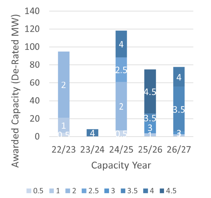 Figure 9 - Battery Storage - 10 year Awarded New Capacity by Capacity Year and by storage capacity in hours at full load (0.5 - 4.5)