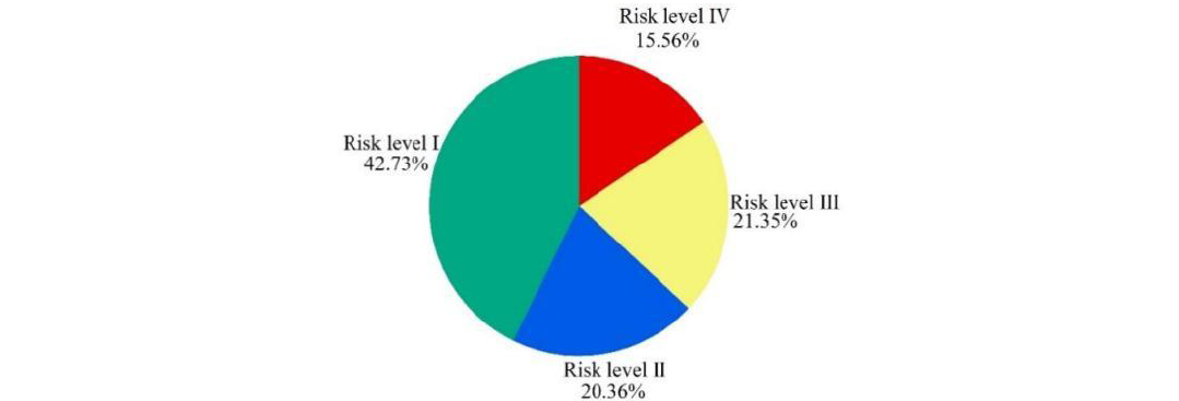 The insulation breakdown risks for all transmission line sections above 110kV in the Guizhou Power Grid were computed. For visual representation, the risk values were categorized into four levels, each denoted by distinct colors as outlined in Table 4. The wildfire-related tripping risk levels in the Guizhou Power Grid were distributed as follows: 42.73%, 20.36%, 21.35%, and 15.56% respectively (Figure 7). This signifies that the proposed method adeptly discriminates the wildfire risk distribution along transmission corridors.