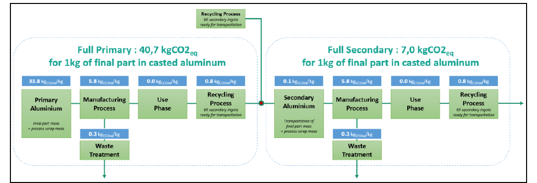 From our hypothesis, to make 1kg of casted aluminum part ranges from 40,7 kgCO2eq/kg with full primary material to 7,0 kgCO2eq/kg with full secondary material. Of course, it depends on actual location of manufacturing steps, and those numbers could be lower considering low carbon energy mix factories. It is however important to get in mind that a null impact does not exist.