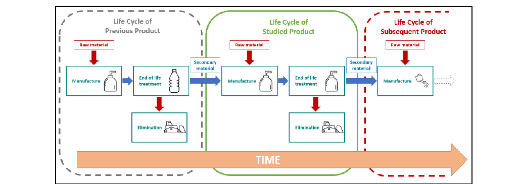 The recycling of materials at end-of-life of a product enables to limit the extraction of Raw Materials (RM) for a next product, and thus remove the impacts related to the manufacture of RM. Figure 13 shows an example of three products using the same material: Previous Product, Studied Product and Subsequent Product.