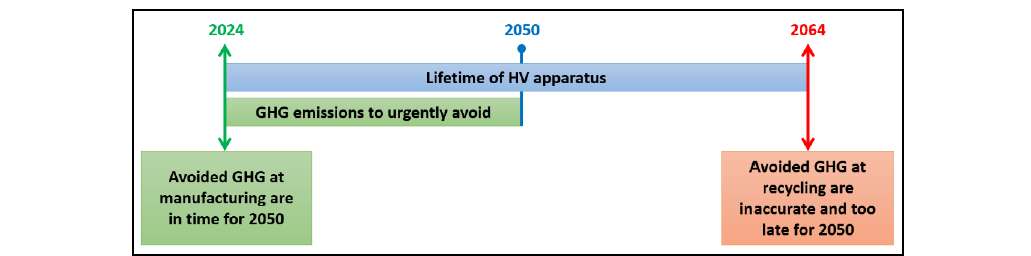 Moreover, this “benefit” / “negative offset” shall not hide a strong impact during manufacturing and use phase of long lifespan products such as high-voltage products. It is especially true regarding Greenhouse Gas (GHG) Emissions. Having a 40-year-lifespan, to rely on recycling at end-of-life of the product installed in coming decade is not relevant to reduce GHG emissions before 2050.