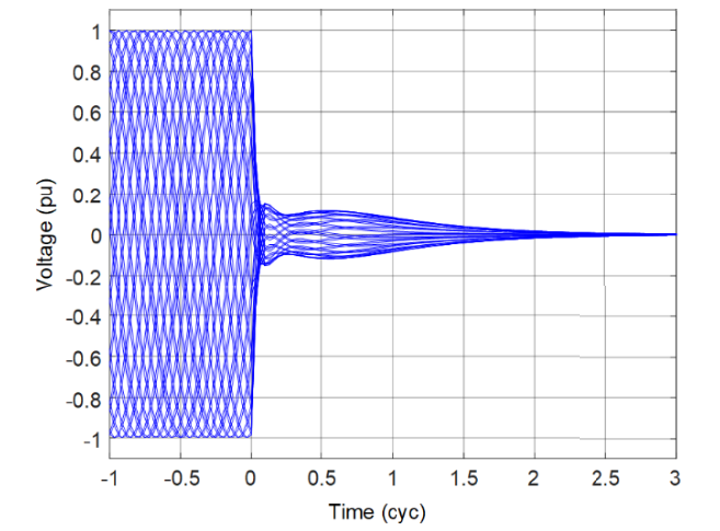 During fault conditions, a significant transient component is present in the CCVT secondary voltage. That transient is proportional to the change in voltage between the pre-fault and fault states. In high SIR applications, the voltage changes from the pre-fault nominal value to a very small value. Figure 1 through Figure 3 show the CCVT secondary voltage for sample CCVTs. Each figure shows a set of waveforms for bolted faults at the CCVT location that occur at different points on wave. Because the true ratio voltage during these faults is zero, the secondary voltage represents the highest possible CCVT transient. We can see that the magnitude, character, and duration of the CCVT transients depend on the CCVT type and point on wave. Reference [4] provides more information on the CCVT transients in relation to the impact of the CCVT parameters and burden, a transient damping device (if present), and the ferroresonance suppression circuit.