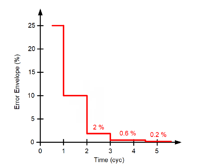 The IEC 61869-5 standard defines three transient accuracy classes by specifying three transient envelopes (see Figure 6 for an example transient envelope). The Draft IEEE PC57.13.9 standard defines two transient accuracy classes. The IEC and IEEE classes are not the same. Our Zone 1 security criterion does not rely on a specific transient accuracy class. Instead, the transient envelope itself is the input to the calculations.