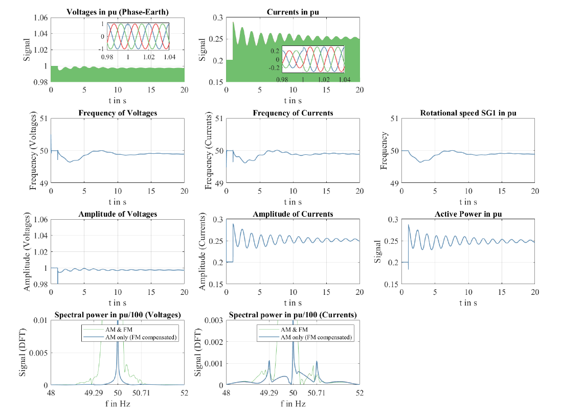 The top row of Figure 8 shows the instantaneous voltages and currents of the synchronous generator SG1 for the first 20 seconds of this transient. While the frequency modulation of voltages and currents is depicted in the second row, the third row shows the amplitude modulation of the signals. The DFT results of the instantaneous signals are presented in the last row.