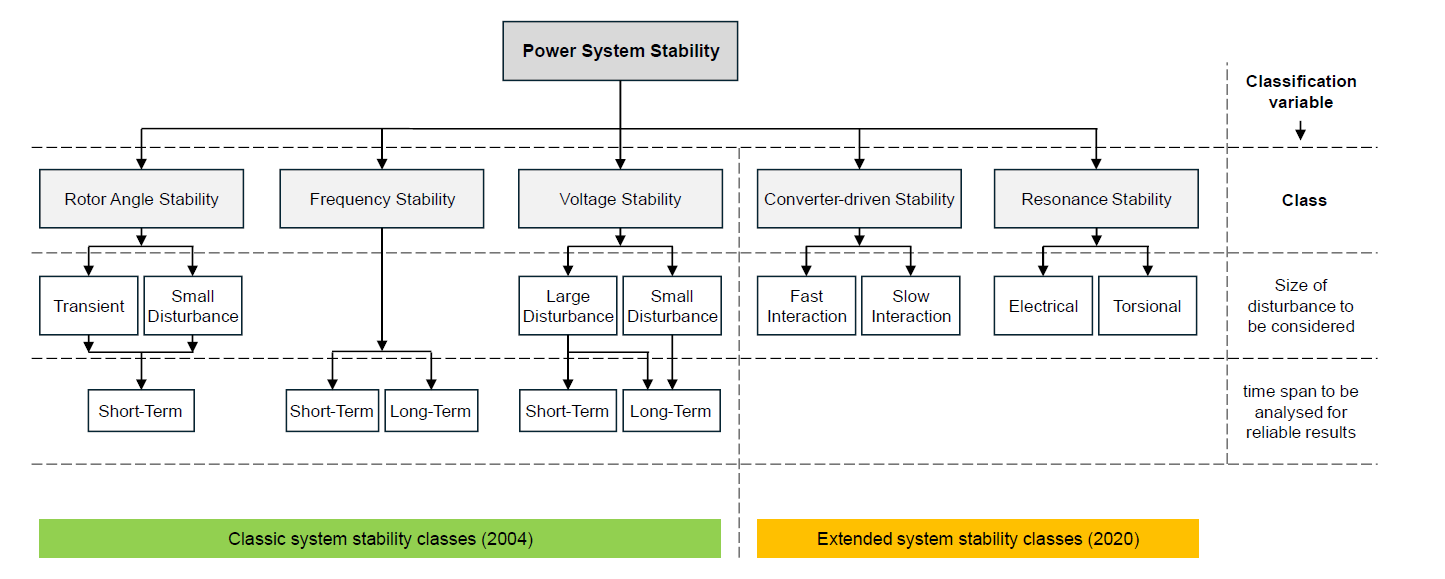 Kundur et al. „classified power system stability for convenience in identifying causes of instability, applying suitable analysis tools, and developing corrective measures”. It should be noted that any form of instability may not occur in its pure form. The classic stability phenomena classes shown in the left side of Figure 1 follow the considerations given above. Table 1 summarises the background information and ideas for the classic system stability classes based on the authors’ interpretation of all information available.