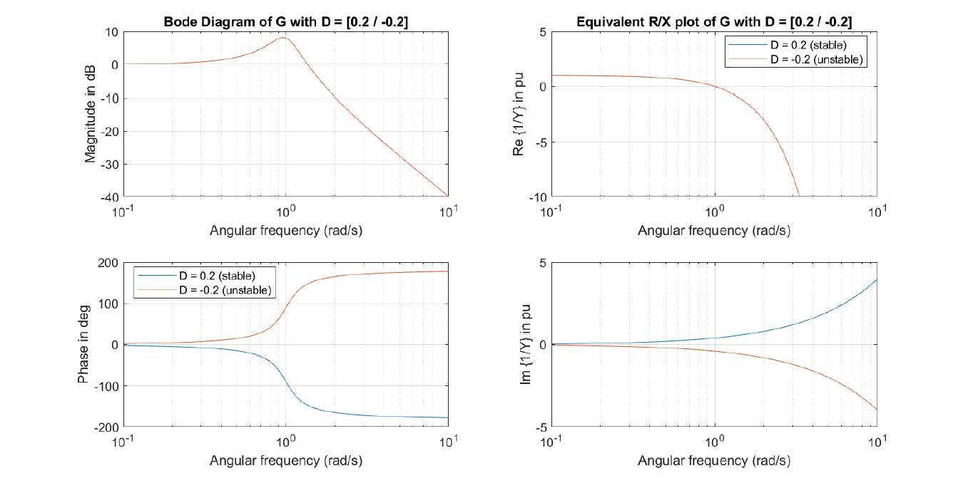 A resonance (Latin for “re-echoing”) is characterised by a strong exaggeration of the system’s magnitude amplification in comparison to an expected amplification and is a feature of the system’s stationary frequency response. The system presents a resonance frequency at 0.98 rad/s with a gain (amplification) of 8.09 dB and a -40 dB decrease per decade regardless of the degree of damping. At resonance frequency, the phase equals -84 and +84 degrees for D = 0.2 and D = -0.2, respectively. A constant ideal sinusoidal input at 0.98 rad/s would be amplified in magnitude by a factor of 8.09 dB ≈ 2.54 and phase shifted by -84 / +84 degrees. Usually, the order of the system’s transfer function is unknown, and the frequency scan results are used to parameterise electric equivalents for system studies. The equivalent electrical resistance and reactances at resonance frequency would be 0.0396 pu and 0.392 / -0.392 pu, respectively. The subsystem G is nonpassive for frequencies starting from 1 rad/s regardless of its degree of damping or stability.