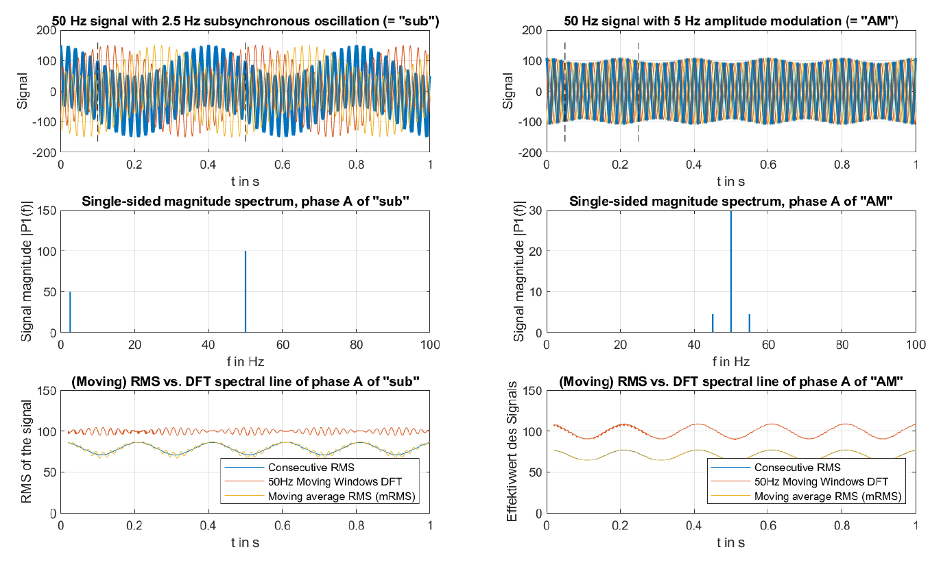 When looking at the power-frequency RMS values often retrieved from power system measurement devices (third row, blue lines), it is not possible to distinguish between a subsynchronous oscillation and an amplitude modulation. The loss of information associated with the nonlinear RMS calculation completely obscures these phenomena. If a moving window DFT for power frequency (e.g. in accordance with IEC 61400-21-1) was used in addition to the RMS value, it would be possible to differentiate between an amplitude modulation and a subsynchronous frequency (third row, red lines).