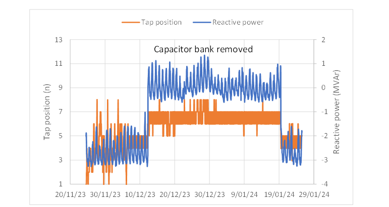 As consumer loads have become inverter-based the power factor has been seen to become unity or leading (e.g. [7]). For example, pumps and motors are supplied by inverters. Manufacturers may use capacitors in power quality filtering to comply with standards. The challenge of a capacitive load is that this creates a voltage rise across the transformer, instead of a voltage drop, moving the OLTC closer to the end of its range. Transformers have a lot of reactance because of the core steel and magnetic fields. In normal circumstances the downstream load is usually slightly inductive, and so there is a voltage drop across the transformer. When there is a flow of reactive power upstream then there will be a voltage rise instead. An example is shown in Figure 2 where the power transformer tap changer was reaching its limit, and when the power factor was rebalanced away from being capacitive the tap changer returned to mid-position. A utility may have installed capacitor banks in a substation for power factor balancing which may not be required any more. In NSW many of these capacitor banks are manually switched, and so control is not automatic.