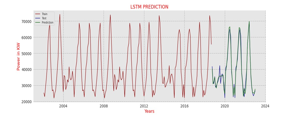 We observed encouraging results in load forecasting through the use and assessment of an LSTM model. The LSTM model successfully learned the historical load patterns and produced precise forecasts for upcoming load requirements. The algorithm showed enhanced accuracy compared with traditional forecasting methods by including weather data, time of day, and historical load statistics.