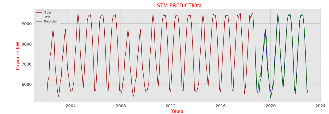 Initially, the system takes data of 21 years, in which 16.5 years of data should be trained, and the remaining data should be tested. Figure 8 shows that the prediction should be based on 5.5 years for the next 10 years. Overlapping indicates predicted data.