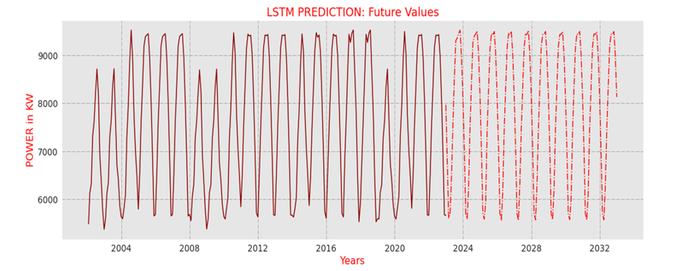 Figure 9 shows the forecasted values for the 10 years, the dotted line represents the Future Values, and the simple line shows the Original Data. This is how the LSTM predicts the data.
