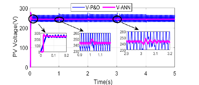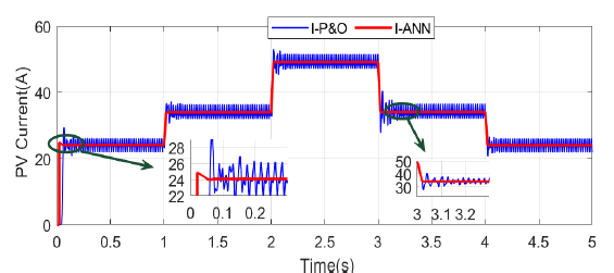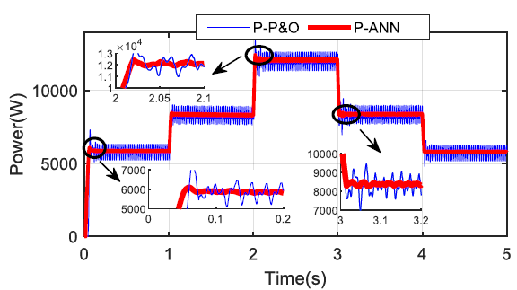 A comparison of the maximum power harvested with the ANN and traditional P&O systems under fixed temperature and variable irradiance is shown in Fig. 14. The ANN outperforms the P&O approach in terms of response time and oscillations, as seen by enlarged photos taken at three distinct sites.