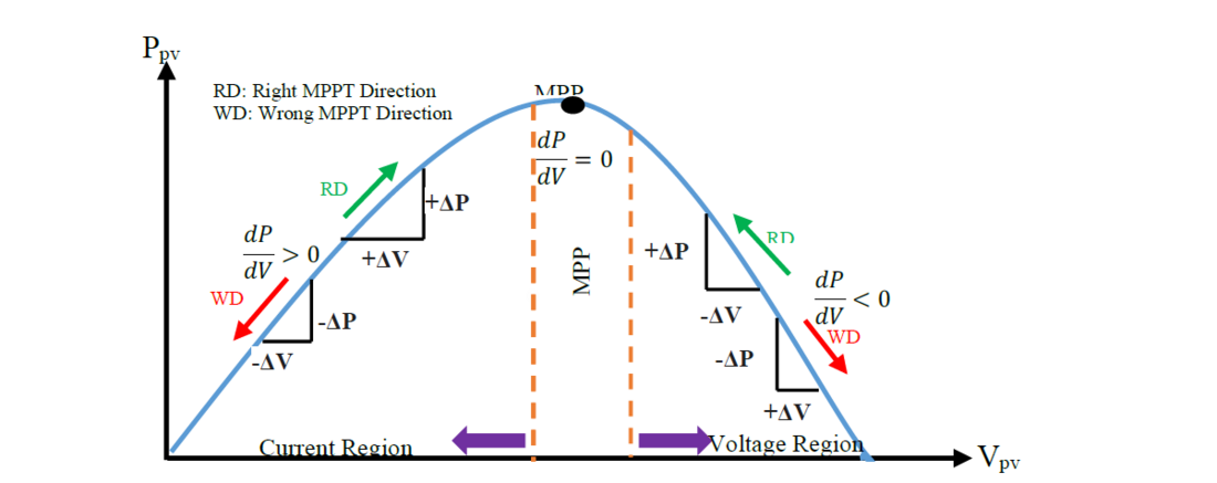 In PV systems functioning at the MPP, the P&O algorithm is an effective technique for MPPT. This method's high efficiency, computational simplicity, and ease of implementation are its main features. Figure 5 and Figure 6 show the algorithm's structure and flowchart, respectively[6]. The P&O algorithm[16]works by altering the array's voltage. Examining the PV array's P-V curve, which is shown in Figure 5, shows that the voltage V rises or falls with increasing or decreasing irradiance on the left side of the MPP, whereas it shows the opposite behaviour on the right side of the MPP, rising or falling. The perturbation's step size might be decreased to lessen oscillations.