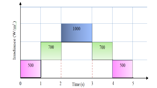 The system, shown schematically in Fig. 1, was modelled and simulated in MATLAB/Simulink. The simulation parameters, including PV system specifications, are listed in Table 3. To evaluate the model's efficacy, we monitored and charged the batteries while assessing overall efficiency using an industrial MPPT charge controller. The MPPT algorithm demonstrates effective tracking capabilities, with a perturbation step set to 𝐷 = 1-4 . The study considers an internal module temperature of 25°C and irradiance variations illustrated in Figure 13.
