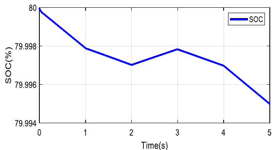 With the battery serving as an extra source to boost the PV-BAT system's efficiency. Figure 17 displays the power values, while Fig. 18 and Fig. 19 display the voltage and current data, respectively. By controlling battery charging and discharging according to energy management when the system is subject to fluctuating disturbances, the battery linked to the PV system's DC bus can increase the system's dynamic efficiency, as seen in Fig. 20. In order to guarantee the system's safe and efficient operation, the control strategy incorporates techniques for controlling system limits and saturation. When the batteries' state of charge (SOC'BAT) hits its maximum or lower limitations, respectively, saturation control uses a dissipation mechanism and regenerative braking in Figure 12.