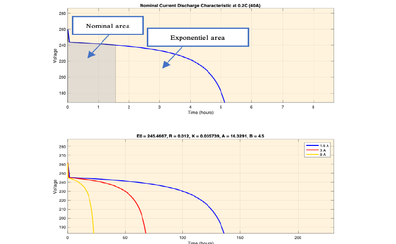 Equation (9) defines the battery's no-load voltage (𝐸),where 𝐸0 is the battery's constant voltage, 𝐾 is the polarization voltage, 𝑄 is the battery's capacity, 𝐴 is the exponential zone's amplitude (in volts), and 𝐵 is the exponential zone's inverse time constant (in ampere-hours per second). The battery has a 40 [Ah] capacity, a minimum voltage of 36 [V], and a fully charged voltage of 52.26 [V]. 17.4 [mA] is the lowest dischargeable current. With a nominal capacity of 36.25 [Ah], the voltage in the exponential region is 48.8 [V]. The internal voltage is 48 [V], and the internal resistance is 0.024 [ohms]. According to the discharge characteristics displayed in Figure 11, the battery voltage response time is 30 seconds.