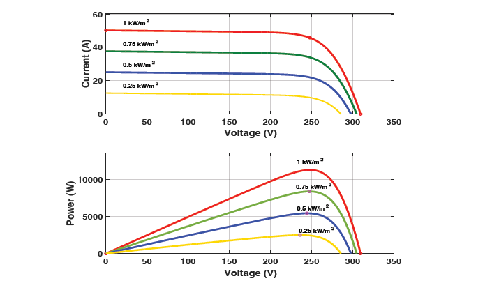 Each panel has the following specs and a 135[W] power rating: At the peak power point, the voltage is 243[V], the current is 50[A], the open-circuit voltage is 22[V], and the shortcircuit current is 8.36[A]. The PV system array's overall output can reach up to 12000 [W]. The PV array's power-voltage (P-V) and current-voltage (I-V) characteristics change depending on the amount of light present, as shown in Figure 3.