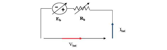 A battery is commonly depicted as a controlled power source that is connected to a load with a fixed resistance. The battery voltage (𝐸bat) is determined by the following equation:
