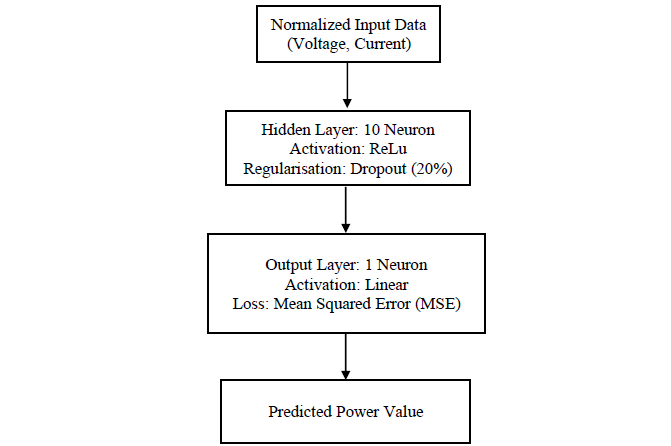 The proposed ANN-based MPPT controller adopts a three-layer feedforward network, illustrated in Figure 9. The network's structure is defined by various factors, including the number of layers, the quantity of neurons in each layer, the type of activation function in each layer, and the interconnections between layers. Among several activation functions[26], our ANN model employs the sigmoid function for the hidden layer. Notably, the sigmoid function is characterized by a positive first derivative value, making it conducive to the learning algorithm, and its output is constrained between 0 and 1. In preliminary experiments, the sigmoid activation function was explored to normalize network outputs. However, for regression tasks involving unbounded targets power or voltage, we adopted a linear output activation. This choice eliminated artificial constraints on prediction ranges, reducing the mean squared error (MSE) compared to sigmoidbased configurations. The linear activation aligns with standard regression practices, where outputs must scale freely to match continuous physical phenomena. The sigmoid function is mathematically defined in (8). Figure 9 shows the schematic representation of the neural network-based MPPT controller.
