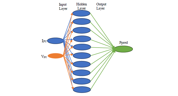 This study uses an ANN to maximize the power output of a photovoltaic (PV) system, accounting for the nonlinear power-voltage (P-V) and current-voltage (I-V) curves, as well as the effects of temperature and solar radiation. A multilayer perceptron (MLP) was specifically selected for its effectiveness in modelling nonlinear systems [21]. An MLP consists of multiple layers of neurons, with signals flowing from the input layers to the output layers. Neurons in the same layer are not connected to one another. The ANN structure includes three layers: an output layer, an intermediate hidden layer, and an input layer. The number of layers and neurons in each layer was determined through a series of systematic tests aimed at optimizing the network's performance [22]-[23].