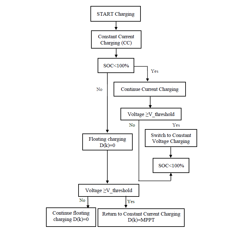 The predefined threshold refers to the target voltage for fully charging the battery. For the lead-acid batteries used in this system, the target voltage is 52.26 V, marking the transition from constant current charging to constant voltage charging. Once this threshold is reached, the battery enters the constant voltage phase, maintaining a steady voltage to prevent overcharging. If the battery voltage falls below this threshold, the MPPT controller reverts to constant current charging to ensure proper charging and avoid undercharging.