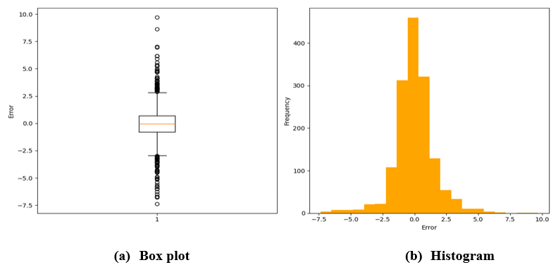Box plot illustrates the distribution of prediction errors to analyze the model’s residuals. Box plot is a standardized way of displaying the distribution of data based on five-number summary. Box plots are specifically useful for comparing the distributions across different groups, as it can generate clear visual summary and variability. In Figure 14 (a), the median error is very close to 0, meaning the model is unbiased on average. Besides, most the errors fall within a small range around 0, reflecting good overall accuracy. Hence, box plot of figure 13(a) performed well with most predictions having low error.