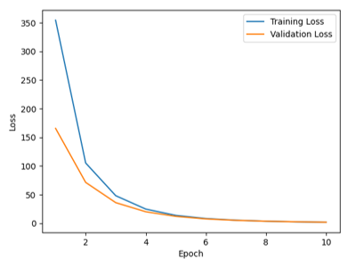 Figure 19 showcases the model loss plot, in which the blue curve represents the training loss and orange curve depicts the validation loss. Training loss starts by very high (around 350) and drops significantly in the forest few epochs. By epoch 5, the curve flattens and converges close to zero by epoch 10. This indicates that the model is learning efficient and minimizing its errors during training. For validation loss, the curve starts at a relatively lower value (about 150) and decreases steadily. By epoch 5, validation loss stabilizes and remains close to the training loss, depicting that the proposed model generalizes well to unseen data and is not overfitting. Therefore, the steady decrease of both curves and its convergence by the end of the training indicates well-trained model.