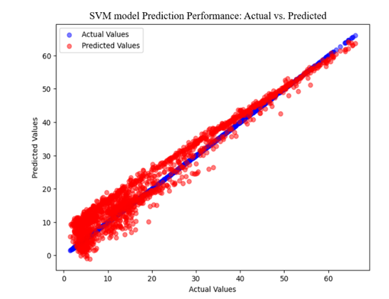 The Regression performance of SVM for actual vs. predicted is demonstrated in the figure 16. Here, the points align closely along with diagonal, indicating the models predictions are nearly identical to the actual values and there are no significant outliers or deviations in the model which hinder the performance of the model. Hence, the strong linear patterns confirms that the regression model has captured the relationship between he features and the target variable decently.