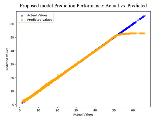 Figure 20 showcases the actual vs. predicted values for the proposed model, in which the alignment of the points indicated a strong correlation between actual and predicted values, stamping its superior performance of the model. Moreover, the proposed model has captured the underlying patterns in the data accurately and precisely. Therefore, strong performance with minimal error spread and strong alignment between actual and predicted value have been unveiled by the model.