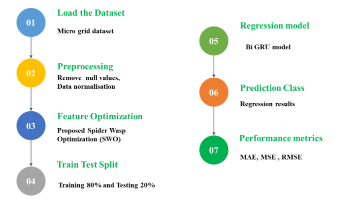 Figure 2 demonstrates the process involved in proposed framework, where the microgrid dataset is used. Once the dataset is loaded, pre-processing takes place, where removal of null values and data normalization is carried out. After pre-processing, feature optimization is carried out using the proposed SWO algorithm, where PPCBO and FFSPM are used in the exploration and exploitation phase. Using the proposed SWO, optimal features are selected for the model. After feature optimization, a train-test split is carried out, where the training data is split into 80% and testing data is split into 20%. Eventually, the regression model is used for predicting the energy consumption and usage of power of the model by using BiGRU approach. Finally, the performance of the model is assessed by employing metrics such as MAE, MSE, RMSE and R2.