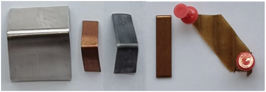 Figure 11 - Testing of a synthetic ester for corrosion - from left to right: DIN 51353 (non-corrosive), ASTM D1275 copper (non-corrosive), ASTM D1275 silver (corrosive), IEC 62535 copper and paper (non-corrosive)