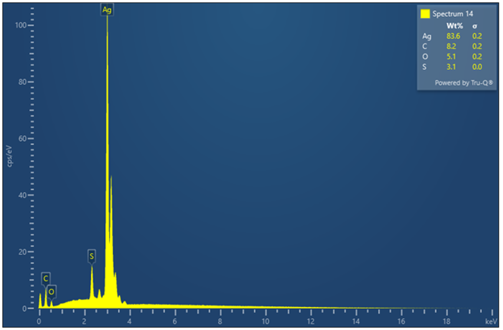 Figure 16 - Example of an EDX analysis of the silver plate (3.1 % wt. Sulphur) after ASTM D1275 testing on synthetic ester with 0.53 mg/kg of elemental sulphur