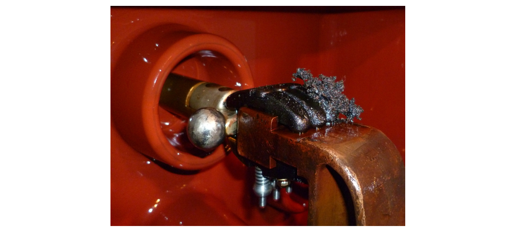 Another new case of corrosion in mineral oil was reported involving a 40-year-old 300/23 kV 735 MVA generator step-up (GSU) transformer originally filled with mineral oil containing excessive amounts of potentially corrosive sulphur (i.e. DBDS) that had also been passivated. Approximately 18 months after passivation, DGA results indicated a severe overheating fault in the red phase selector and not in the main tank and other two selectors. Internal inspection discovered significant copper and silver whiskers in the faulty changeover contact, as shown in Fig. 2. The passivator content was found to still be at 72 mg/kg.