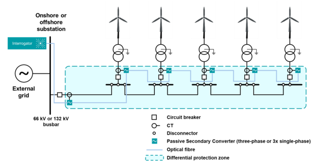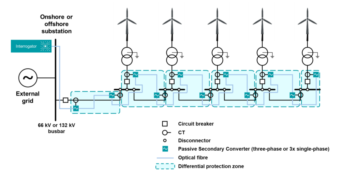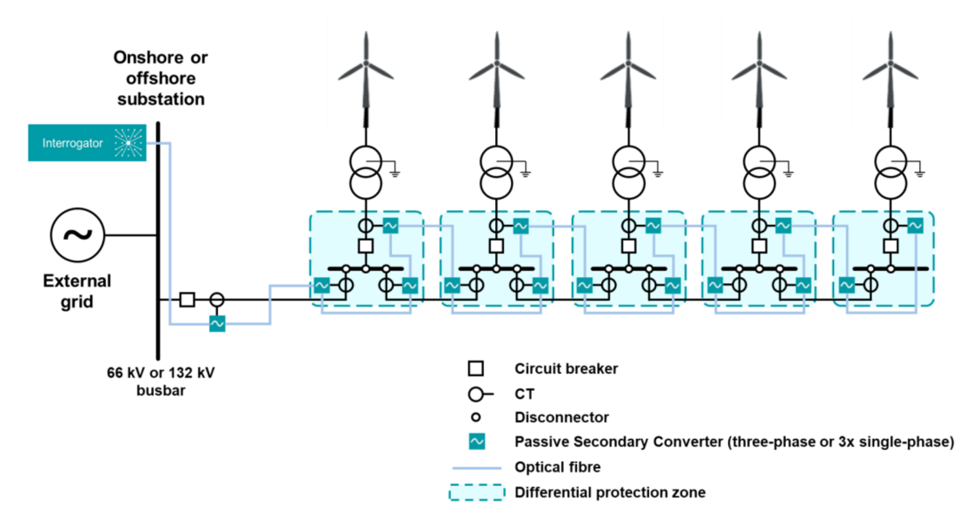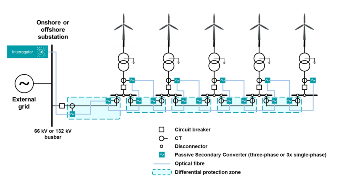 Differential protection provides excellent fault discrimination and trip times. Differential protection requires a communications channel, and fiber optic links are already available between WTG locations and the collector substation. However, there is a lack of scalable options on the market based on conventional instrumentation which can be applied to the offshore wind collector networks (typically up to a dozen cable sections with a dozen tapped WTGs).