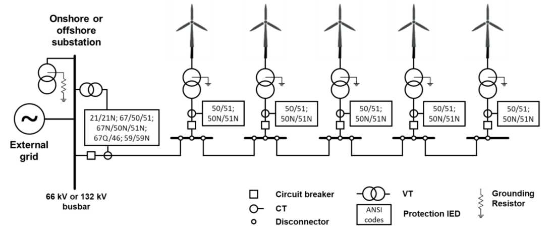 The complexity and importance of collector networks necessitate a highly reliable, selective, sensitive, fast, and economical protection system, as the availability of power generation is considered the top priority. The existing best practice for the IAC protection system philosophy that covers most of the typical collector network configurations for offshore wind farms is as follows (refer to Figure 1).