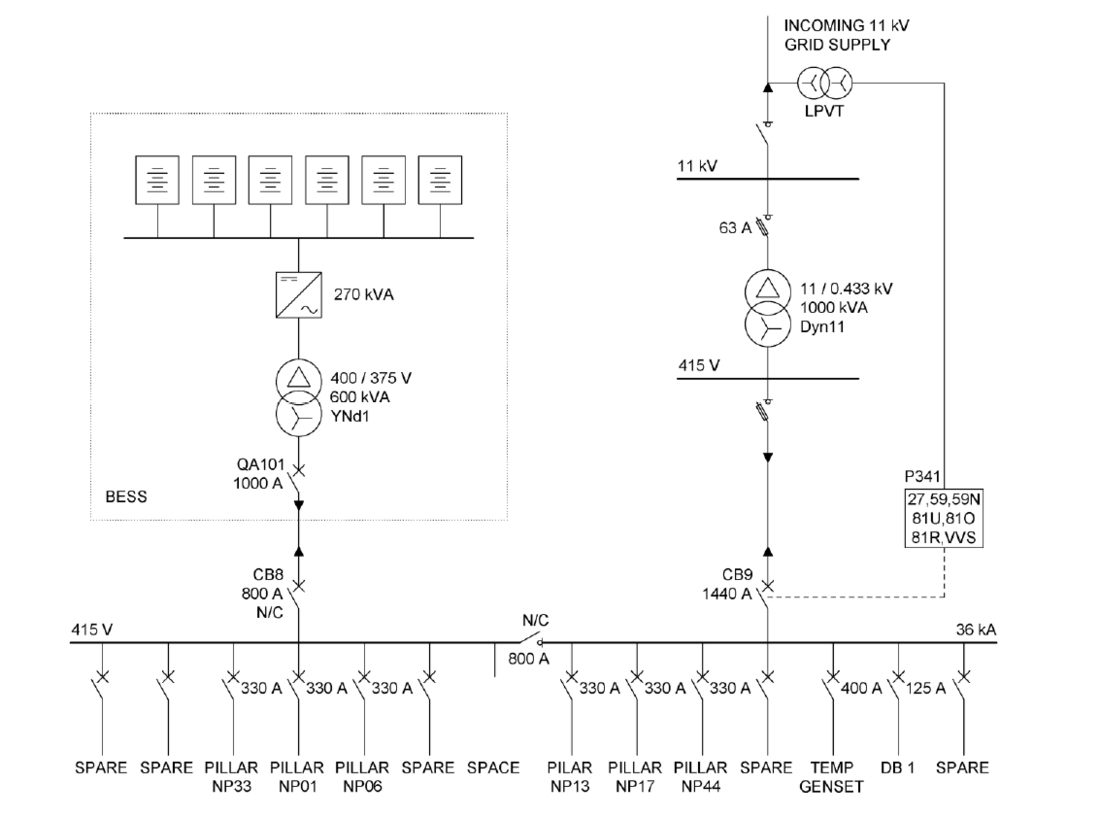 While the BESS incorporates internal protection against inadvertent unsynchronised paralleling with the grid, an external check synchronisation (ANSI Device No. 25) function was included as an additional safeguard. The LOM protection relay selected has check synchronisation capability, so this could be implemented at no additional cost. The LOM relay already had a three-phase voltage input from the LPVT on the 11 kV side of the supply transformer, so this was used to monitor the grid supply for check synchronisation. The relay has a second, single-phase voltage input that is used to monitor the low voltage (400 V) BESS supply. The relay incorporates settings to compensate for the 30° phase shift between the HV and LV windings (Dy11) of the 1000 kVA supply transformer. However, it was necessary to incorporate an interposing voltage transformer on the LV voltage input to the LOM relay, as the relay model used could not directly connect a voltage as high as 400 V phase-phase.