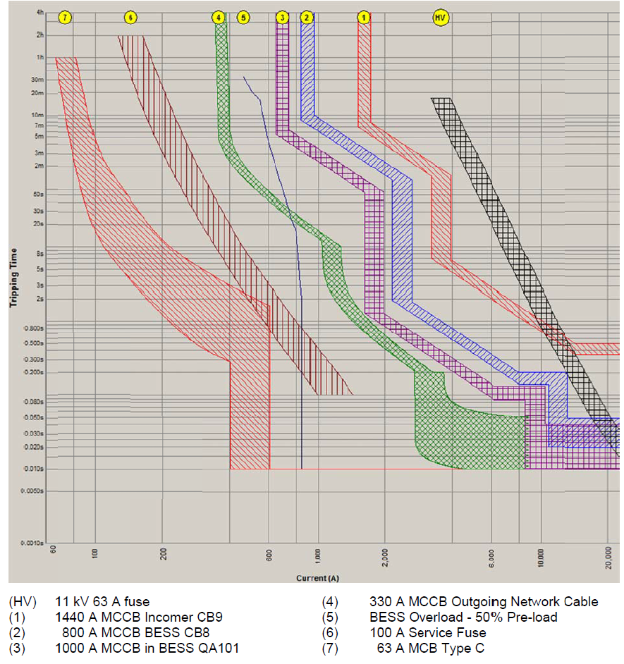 It can be seen from Figure 2 that all three layers of protection will clear a fault of up to 844 A well within the 2 s overload time of the BESS. A 100 A service fuse grades below the over-load characteristic of the BESS for all fault currents up to 844 A. At 844 A, the fuse will operate in a time of 0.2 to 0.9 s (allowable time-current zone in AS 60269.3.1), giving a grading margin of greater than 1 s to the BESS overload characteristic.
