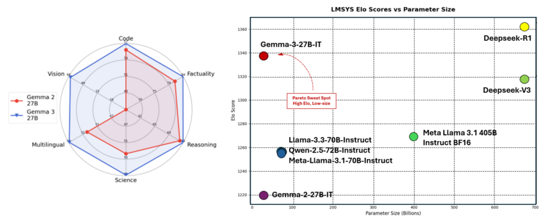 Figure 3 – Summary of the performance of different pre-trained models from Gemma 2 and 3 across general abilities (left); Gemma 3 27B is in the pareto sweet spot (right) [12]