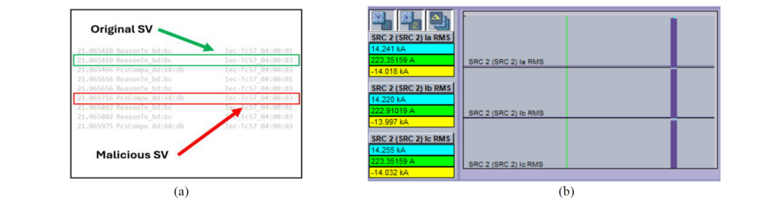 Figure 4 – (a) Captured SV packets at the attack with receipt time, (b) Response shown in the data logger of P&CIED for the attack