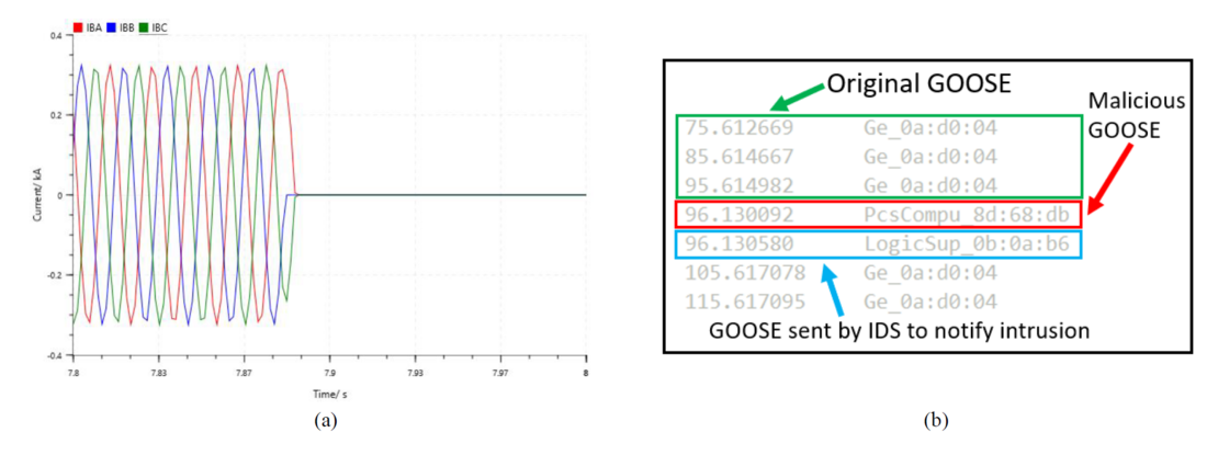 A previously captured GOOSE packet with a ‘True’ boolean state to operate the CB was injected into the process bus. MUIED was tricked with the receipt of this malicious GOOSE packet and generated a CB trip signal while the system was not experiencing any fault conditions. Figure 5(a) illustrates this scenario in which the CB operated while the feeder current was normal. When the stNum and sqNum of the malicious packet and the last original GOOSE message are compared, clear mismatches can be observed. These mismatches are detected by the employed NIDS. NIDS detects the mismatch and publishes a GOOSE message to notify the intrusion. A measure of the NIDS detection time was obtained using a captured GOOSE packet, as shown in Figure 5(b). It was identified that the detection time is under 0.5 [ms]. However, this NIDS cannot detect cyber attacks that follow the protocol rules. A spoofing attack crafted by following the sequence numbers and sampling time frame rules cannot be detected.