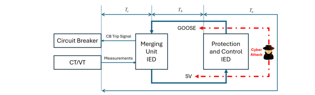 The time needed to receive measurements by MUIED, send them as SV, process the received data P&C IED, and send the GOOSE to the outgoing buffer for publishing is 𝑇𝑎, whereas 𝑇𝑏 is the time delay in the network communication for the GOOSE packet. 𝑇𝑐 is the time needed to save the GOOSE at the incoming buffer of the MUIED, process the data, send the CB trip signal, and operate the CB. If the deployed detection and mitigation mechanisms in the cyber layer are successful, a malicious trip signal will not be received by the physical CB. For the design and validation of such mechanisms, identification of the above-defined time frames is critical.