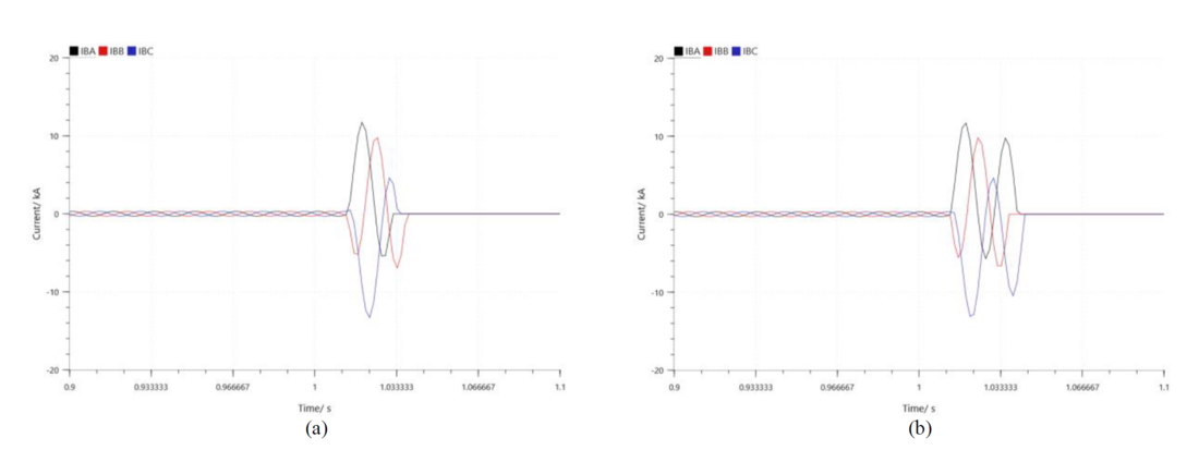 Figure 6 – Feeder currents when CB is tripping with (a) P&CIED 1, (b) Simulated IED