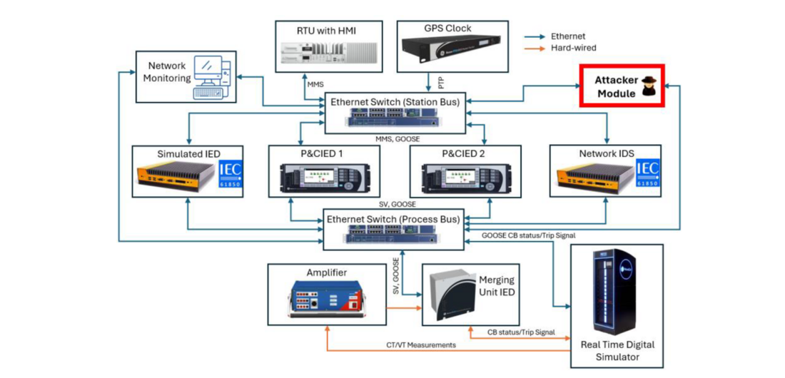 The HIL testbed utilized in this project is built with industry-grade devices typical in an IEC 61850-based digital substation, as depicted in Figure 2. The physical layer of the power system is modeled using a real-time digital simulator. The merging unit IED, which is connected to the real-time digital via an amplifier, translates the hardwired communication signals into Ethernet-based data packets and vice versa. The data sent by the MUIED is received by two P&CIEDs. At the station level, a Remote Terminal Unit (RTU) with an integrated Human-Machine Interface (HMI) is deployed. The RTU serves as a communication node between the substation and the control center. A Global Positioning System (GPS) clock is used to synchronize substation devices with IEEE 1588 Precision Time Protocol (PTP). To simulate cyber threats, an attacker module is implemented. A network intrusion detection system (NIDS) [5] is also incorporated for detection testing. Additionally, a simulated IED, designed to replicate the functionality of the P&CIEDs, is included in the testbed. NIDS and simulated IED are programmed using an open-source IEC 61850 library on Linux computers.