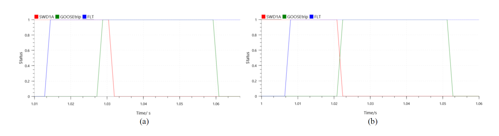 Figure 7 – CB trip signal (SWD1A), GOOSE trip, and fault signal (FLT) for CB operation with (a) MUIED, (b) Breaker IED