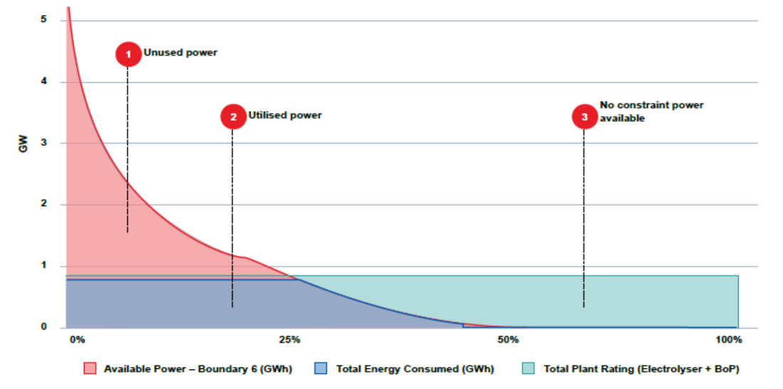 To justify the high capital costs of electrolysers, a viable business model is needed, particularly if the facility relies on intermittent operation aligned with electricity network constraints. While the Balancing Mechanism (BM) offers opportunities to access low or negative prices during high constraint periods, it is volatile and uncertain, making reliance on it commercially risky. To manage costs and maximise revenues, facilities must optimise between different power sources. However, current market structures place too much risk on investors, offering insufficient incentives for hydrogen production to locate in constrained areas or respond flexibly to network needs. Figure 1 provides an illustration of the constraints experienced (GW) within a year on any one boundary, as indicated by the curve, and the subsequent load factor, hours of the year, that the production facility would operate.