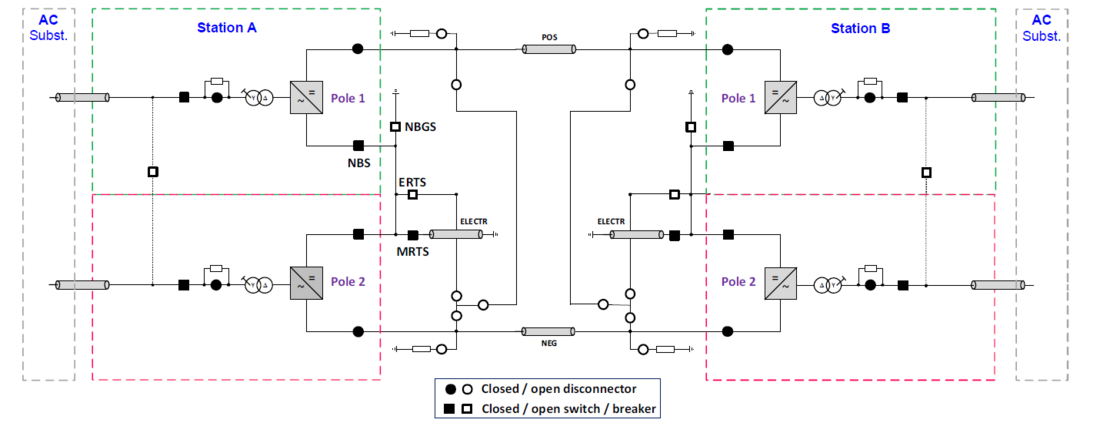 - DC switchgear for quick reconfigurations of the HVDC without power interruption comprising the earth return transfer switch (ERTS) and the metallic return transfer switch (MRTS), as well the neutral bus grounding switch (NBGS) and the neutral bus switch (NBS).