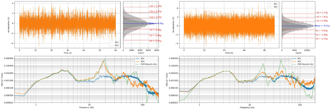 Figure 6 – Comparison between the results of the FE model and test in terms of PSD responses. Upper left: Stationary response in time of A2x and ATx. Upper right: Stationary response in time of A2z and Atz. Lower left: PSD outputs (FE and test) of A2X and PSD input of ATx. Lower right: PSD outputs (FE and test) of A2z and PSD input of Atz