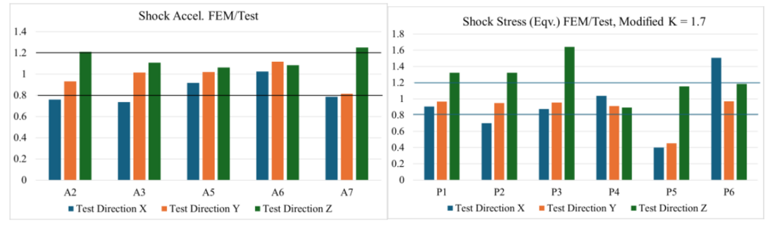 Figure 10 – Comparison of results in the shock loading environment: FE model normalized to those obtained through tests
